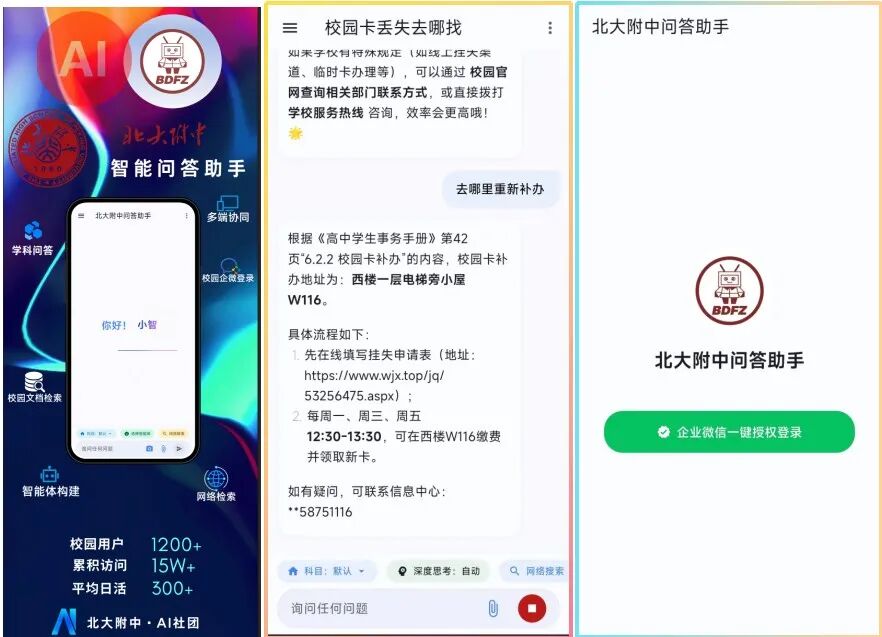 为深入贯彻国家及北京市关于加强中小学人工智能教育的战略部署,北京大学附属中学于2025年3月正式成立“AI+教育协同创新中心”,统筹推进全校人工智能教育发展。过去一年,科学教育中心以师生共研究、自主创新为基调,聚焦人工智能技术在校园学习支持中的深度应用,自主研发并上线多项智能系统,逐步构建起覆盖“教学—学习—服务”的校园智能应用矩阵。