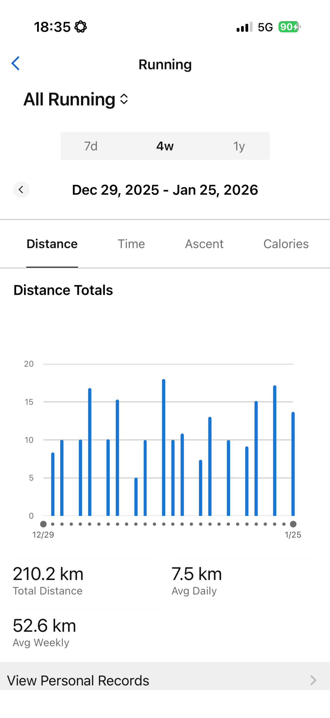现在,我的月跑量在200公里左右,每年都会跑几场半马。