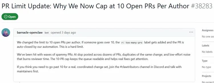 甚至Github在这之后调整了PR的规则限制:我们将上限调整为每位作者 10 个开放状态的 PR。若有人超出该数量,系统会自动添加 r: too-many-prs 标签,并通过自动化程序关闭该 PR。这是一个硬性限制(无弹性豁免)。以及我们近期遭遇了大量垃圾式 PR 冲击:包括批量提交的“AI 生成低质代码(AI slop)”、同一修改的重复提交,以及其他低投入、无价值的冗余内容,这些都严重消耗了代码审核者的时间。