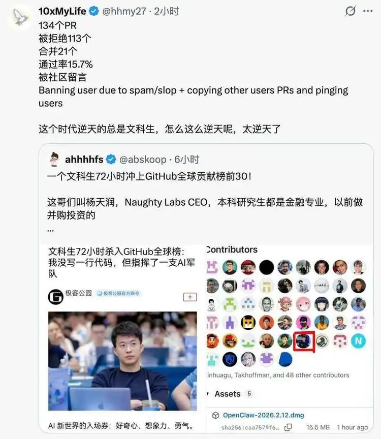 这21个贡献是事实,被官方认证也是事实。但这种错误的描述给广大“龙虾发烧友”们营造了一种“宁有种乎”的形象,同时「文科生」与其他贡献者——十年以上开发经验的硅谷工程师,开源社区的老炮们相比,这个巨大的反差瞬间变成了营销热点,被广泛传播。