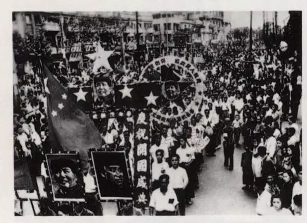 阅兵式结束后,举行了群众游行活动。工人队伍走在游行群众队伍最前面,后面是农民、机关人员、学生等,组成一支象征全国人民大团结的群众游行队伍。参加游行活动的群众精神振奋、热情高涨,不断高呼“中国共产党万岁!”“中华人民共和国万岁!”“毛主席万岁!”面对群众的欢呼,毛泽东同志始终挥手致意。毛泽东同志高呼:“同志们万岁!”“人民万岁!”这更加点燃了游行群众的热情,他们改变了原有的行走路线,像潮水般涌向天安门,纵情地欢呼。据毛泽东同志身边工作人员回忆,大典活动结束后,已经是晚上10点左右,毛泽东同志回到丰泽园,激动地说:“人民喊我万岁,我也喊人民万岁,这才对得起人民呀。”