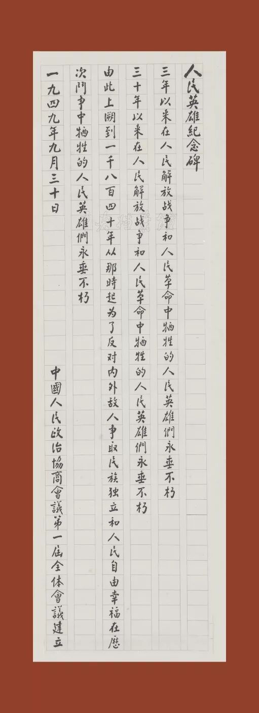 周恩来同志书写的人民英雄纪念碑碑文手稿