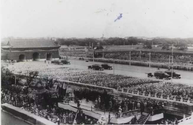10月1日下午2点50分左右,参加开国大典的领导人乘车从勤政殿出发,到了天安门城楼的后边。下车后,毛泽东同志和其他领导同志一起,从城楼西边的楼梯拾级而上,一步一级上了100个台阶。