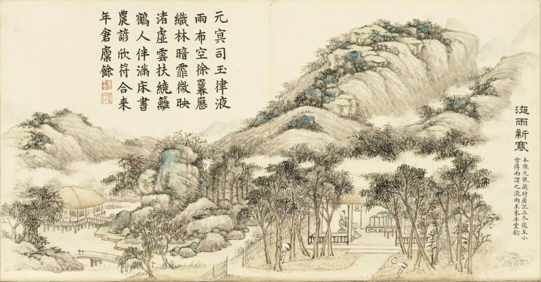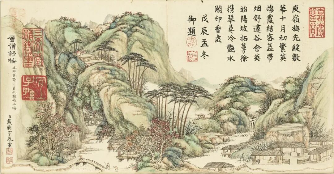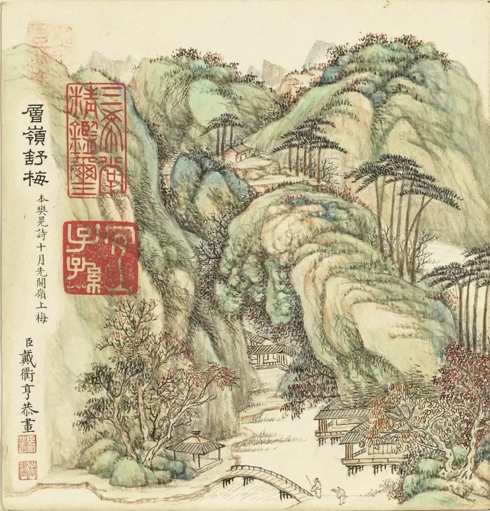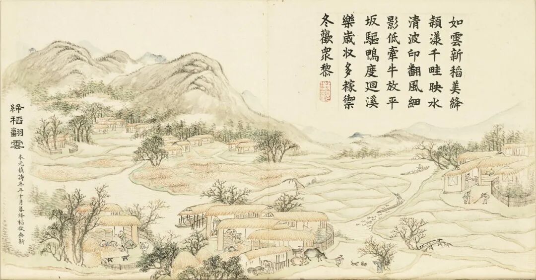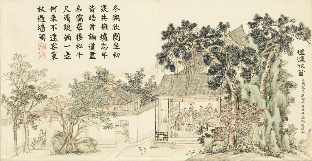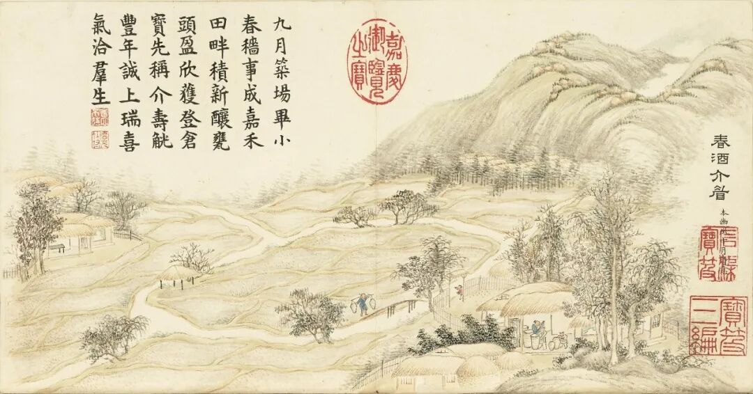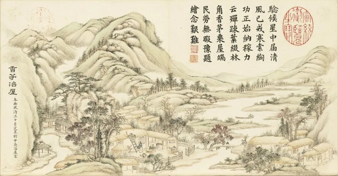 提要:农历十月,有些地区天气暖和如春,故被称为 “小阳春”(也作:小春)。此《小春熙景图》册由清代戴衢亨绘。全册共十六开,描绘了小阳春的美好景象,始于:春酒介眉、香茅治屋。终于:高峰归雁、层岭舒梅。每幅均有清嘉庆帝题诗。此册现藏于台北故宫博物院。