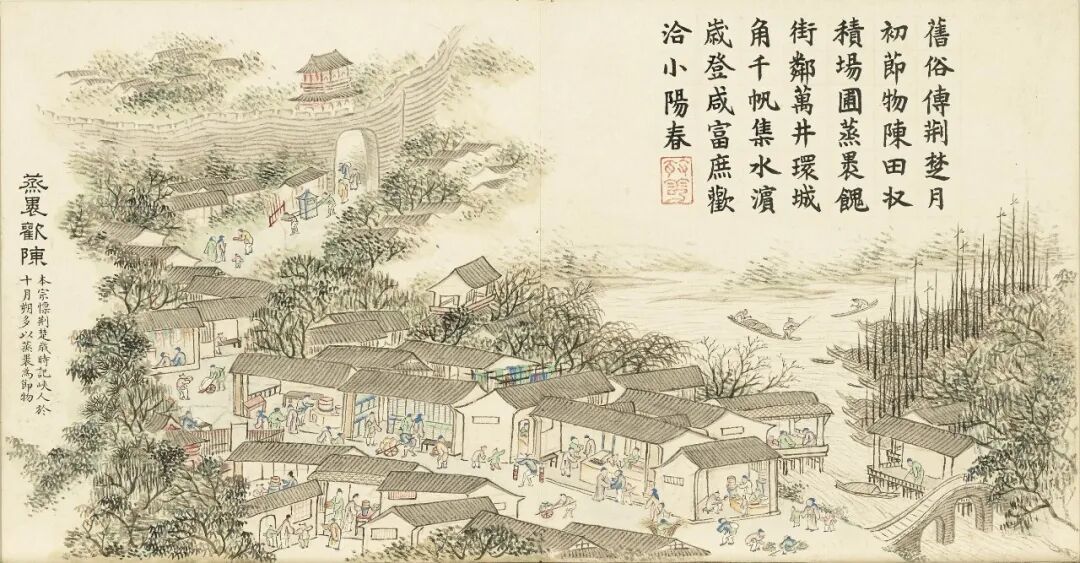 舊俗傳荊楚。月初節物陳。田收積場圃。蒸裹餽街鄰。萬井環城角。千帆集水濱。歲登咸富庶。歡洽小陽春。