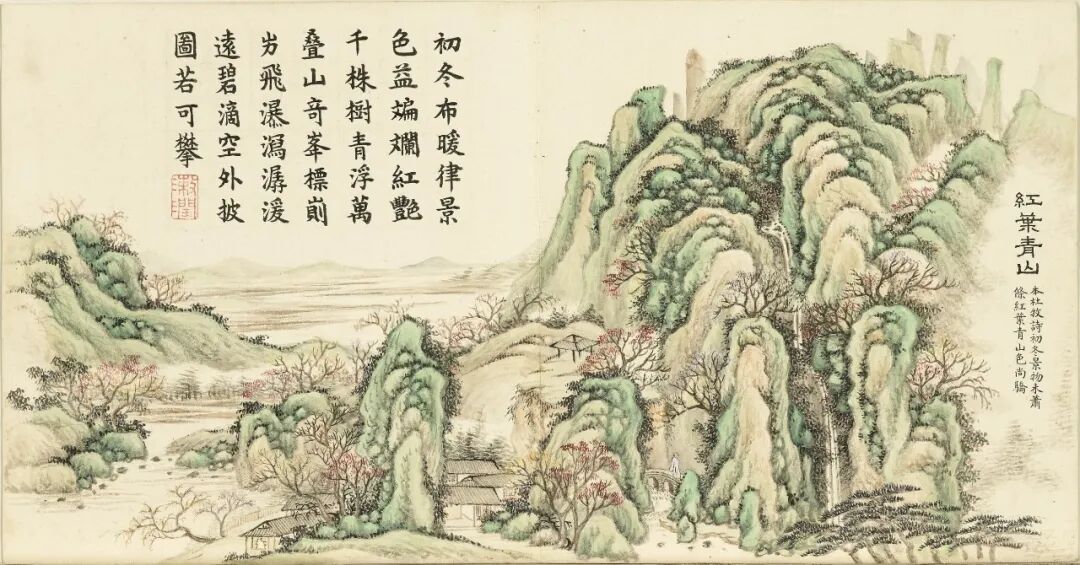 初冬布暖律。景色益斒斕。紅艷千株樹。青浮萬叠山。奇峰標崱屴。飛瀑瀉潺湲。遠碧滴空外。 披圖若可攀。