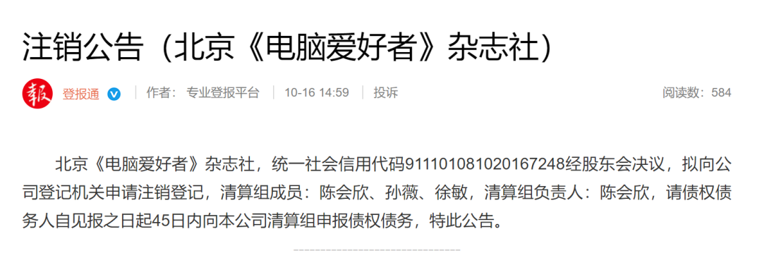 公告内容是:北京《电脑爱好者》杂志社,统一社会信用代码911101081020167248经股东会决议,拟向公司登记机关申请注销登记,清算组成员:陈会欣、孙薇、徐敏,清算组负责人:陈会欣,请债权债务人自见报之日起45日内向本公司清算组申报债权债务,特此公告。