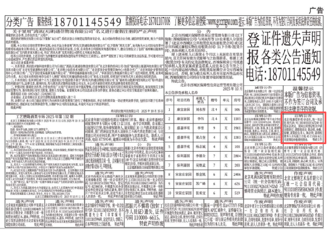 超角度翻看《新京报》电子版,在10月15号报纸的最后一页的右下角,发现了这则注销公告,是真的。