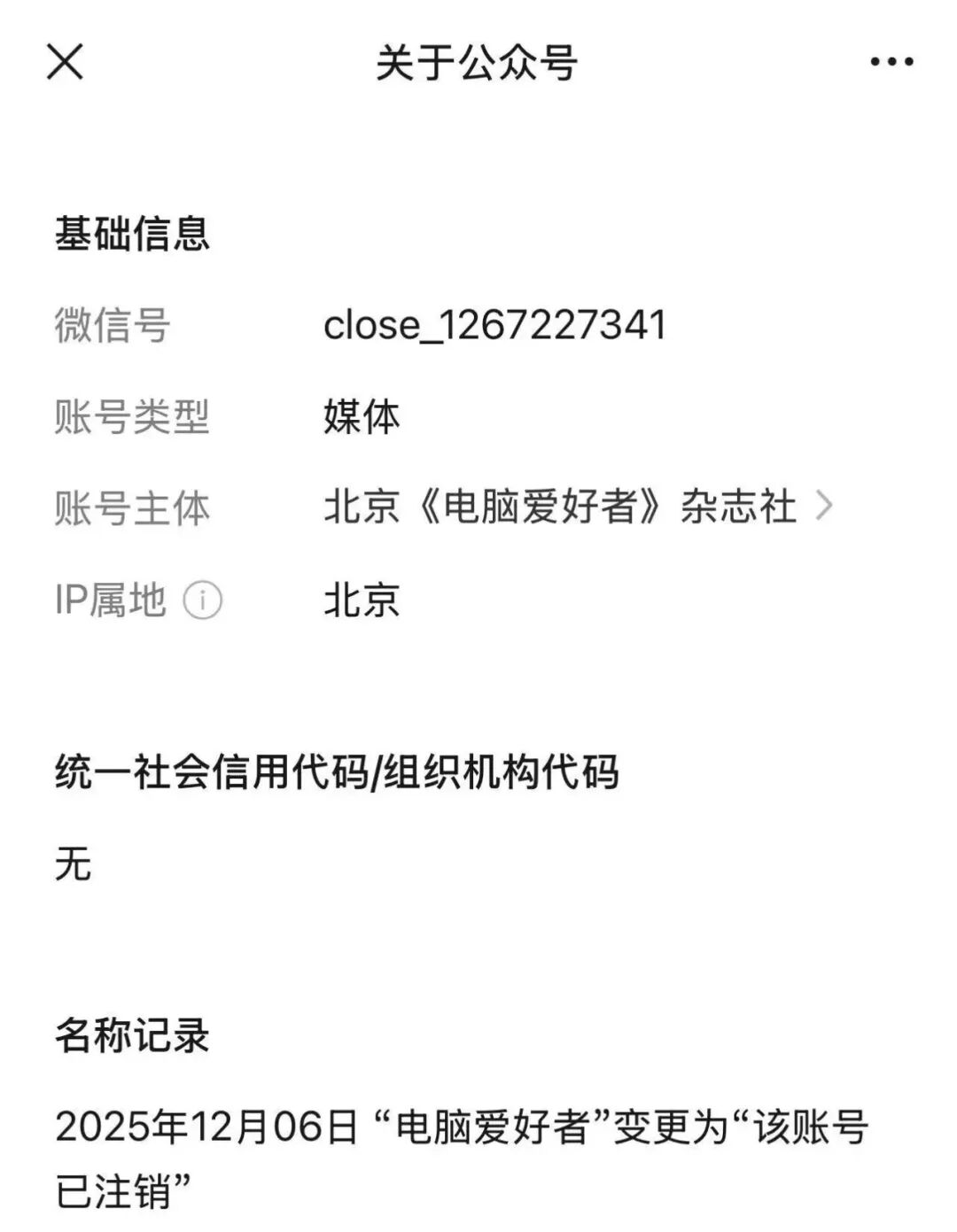 再去看《电脑爱好者》的公众号,显示已自主注销,停止使用。
