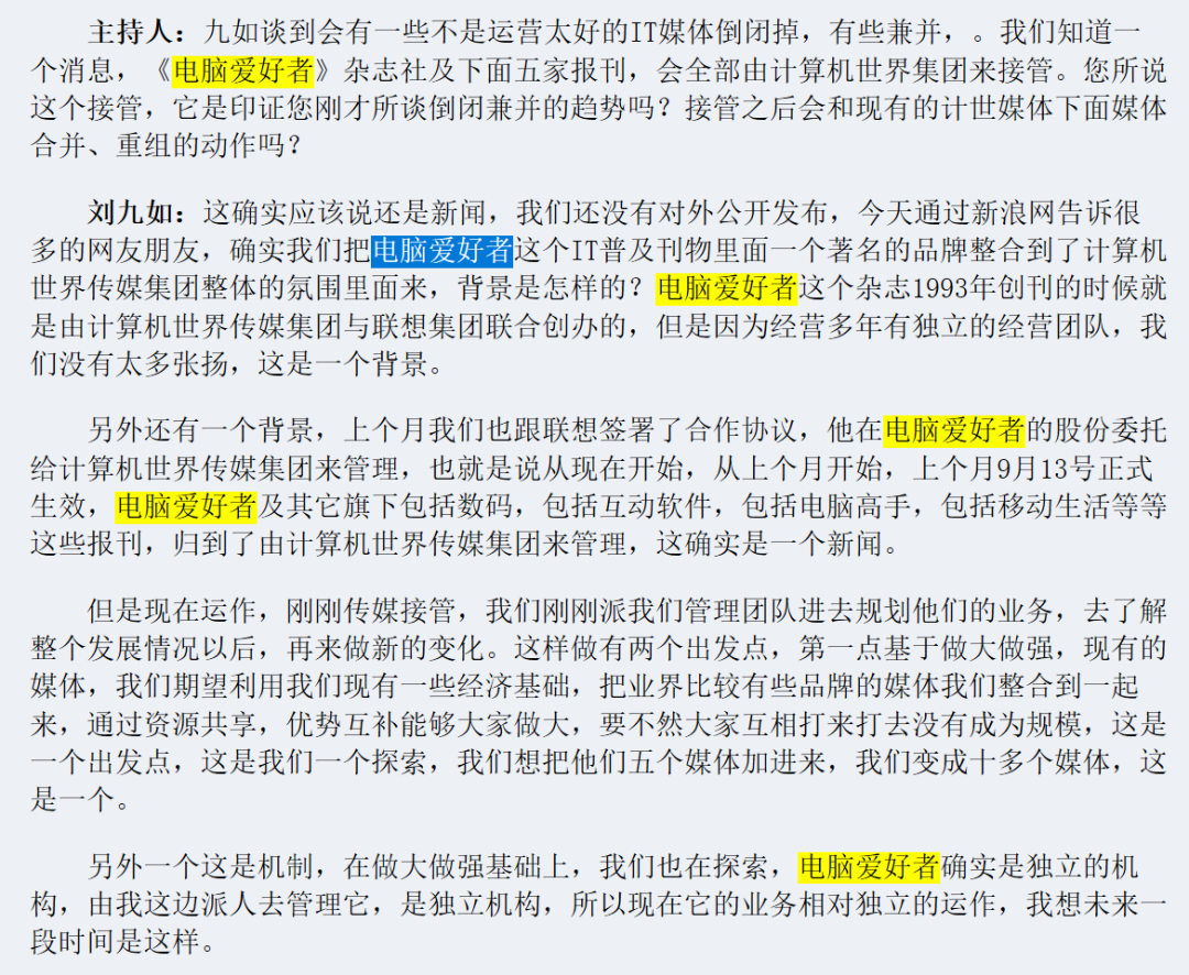 20年前,计世集团总裁、《计算机世界》的社长透露,《电脑爱好者》杂志社及下面五家报刊,会全部由计算机世界集团来接管。“跟联想签署了合作协议,他在电脑爱好者的股份委托给计算机世界传媒集团来管理”。
