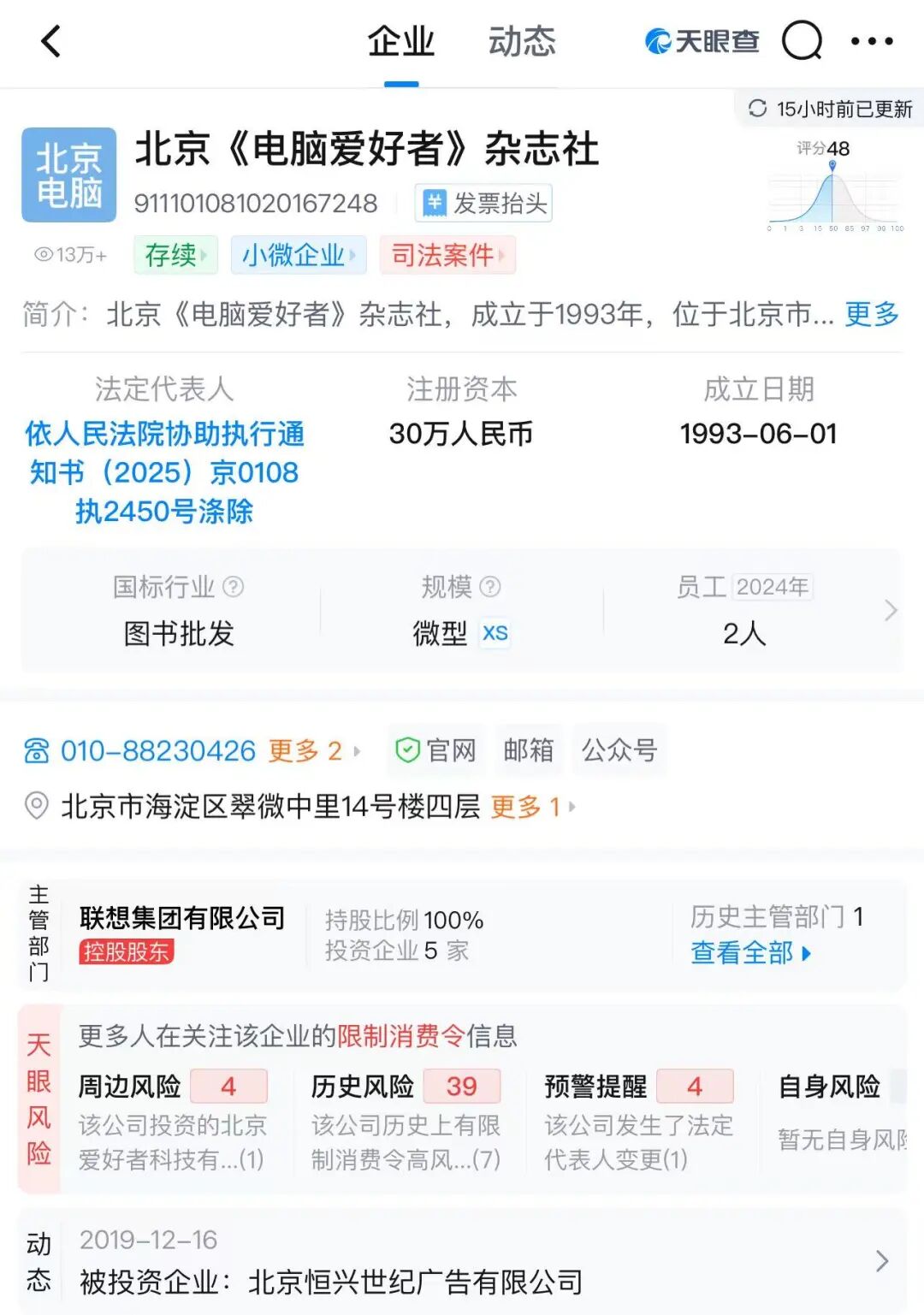 天眼查显示,《电脑爱好者》杂志社的法定代表人已“依人民法院协助执行通知书(2025)京0108执2450号涤除”。