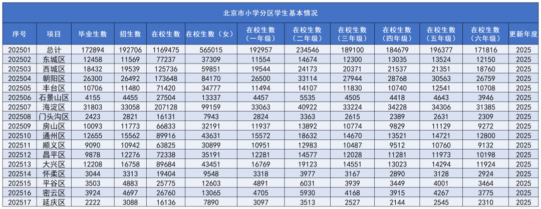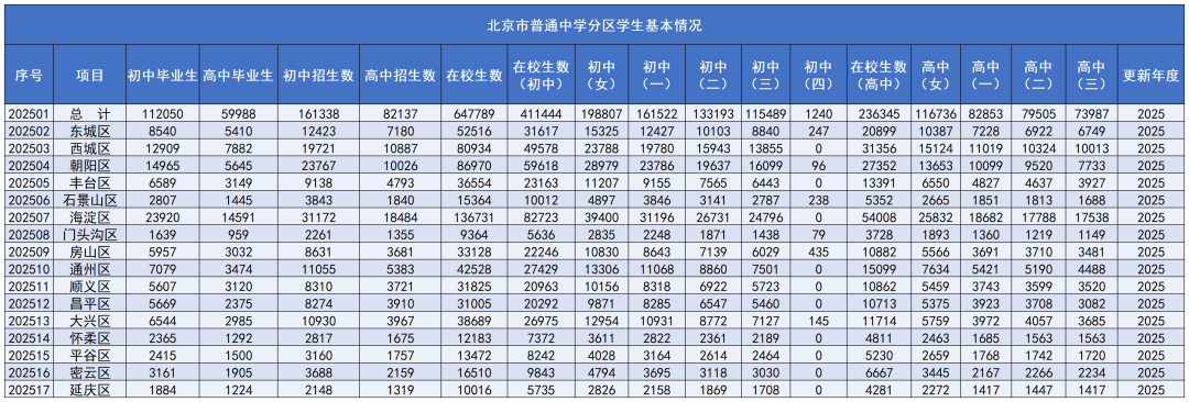 近日,北京公共数据开放平台更新了市教委提供的《小学分区学生基本情况》和《普通中学分区学生基本情况》,数据截止2025年度。