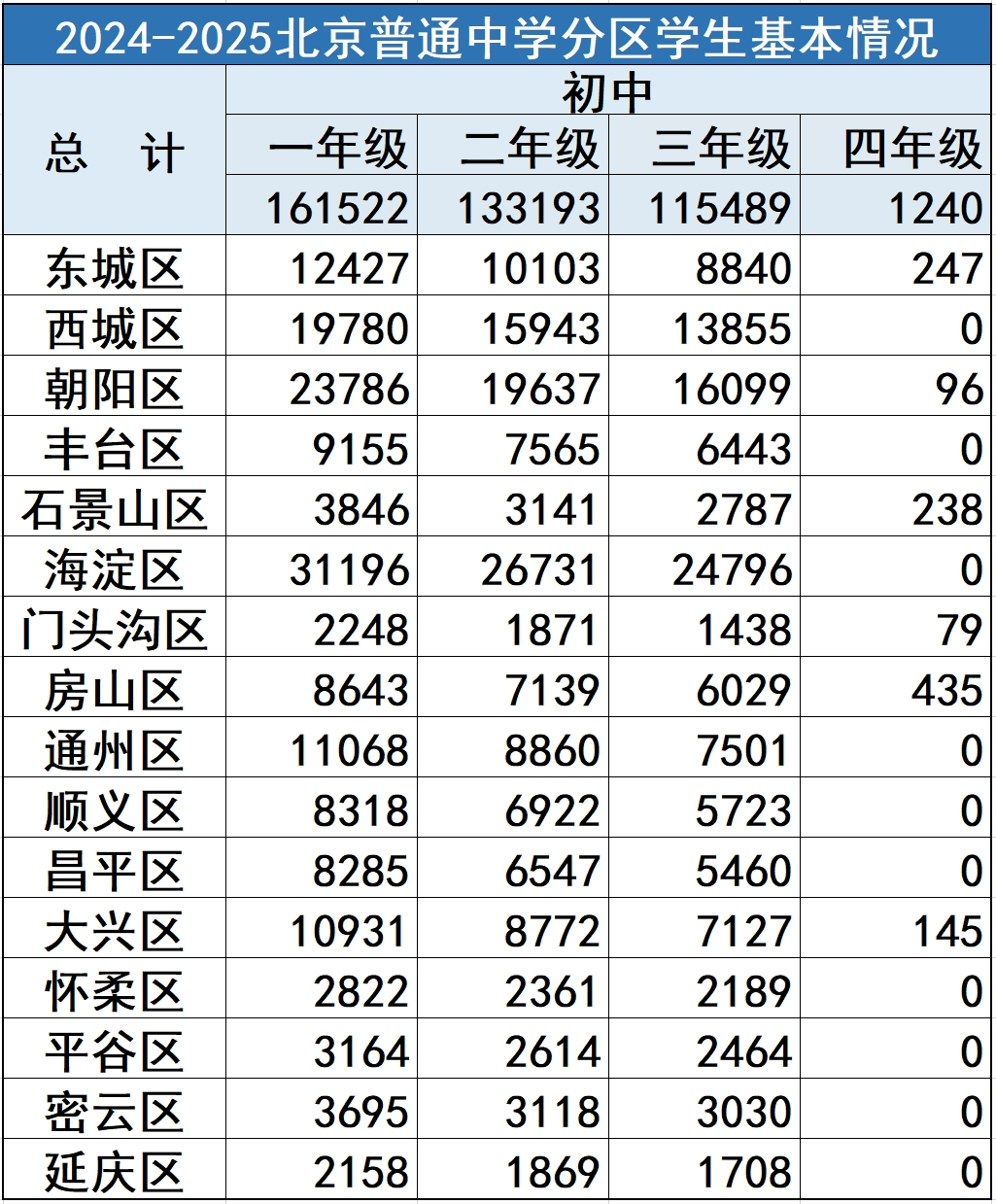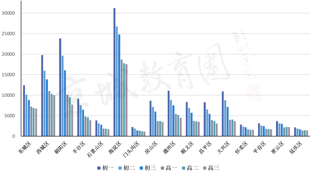 海淀、朝阳、西城、东城四区作为教育大区,初高中在读生总数明显高于其他区,体现出教育资源的集聚效应。