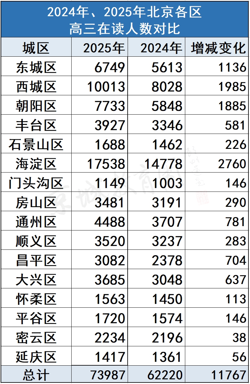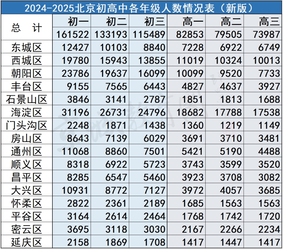 2024-2025年度初三在校生人数为115489人,和前一年同期相比增加509人。其中西城区涨幅最为明显,增加了622人,紧随其后的增加较多的地区有大兴、通州、海淀、朝阳等。 初二人数为133193人,和前一年同期相比增加13664人。其中朝阳涨幅最为明显,增加了2225人。 初一人数为161522人,和前一年同期相比增加26368人。其中海淀区涨幅最为明显,增加了4063人。