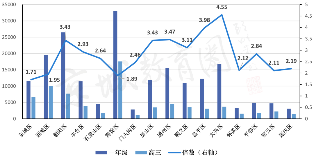 这张图展示了北京各区小学一年级与高三年级的人数对比,蓝色曲线上的倍数值,表示一年级人数和高三人数的倍数关系。