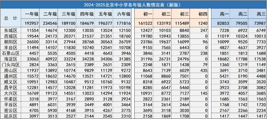 东城、海淀、西城等区从初一到高三各年级人数虽有递减,但降速较缓,整体规模始终保持高位,显示出优质教育资源对学生的留存能力。