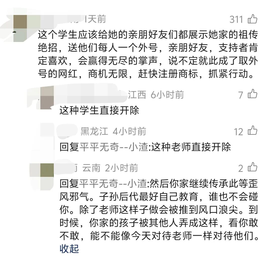 并且还有人认为:如果学生这么恶意的起外号都不能制止的话,那么这个学生应该给自己的亲朋好友,所有的长辈也起一个终身的侮辱性外号,并且长辈们不能急眼动手,如果急眼动手,那就和老师一样的下场。