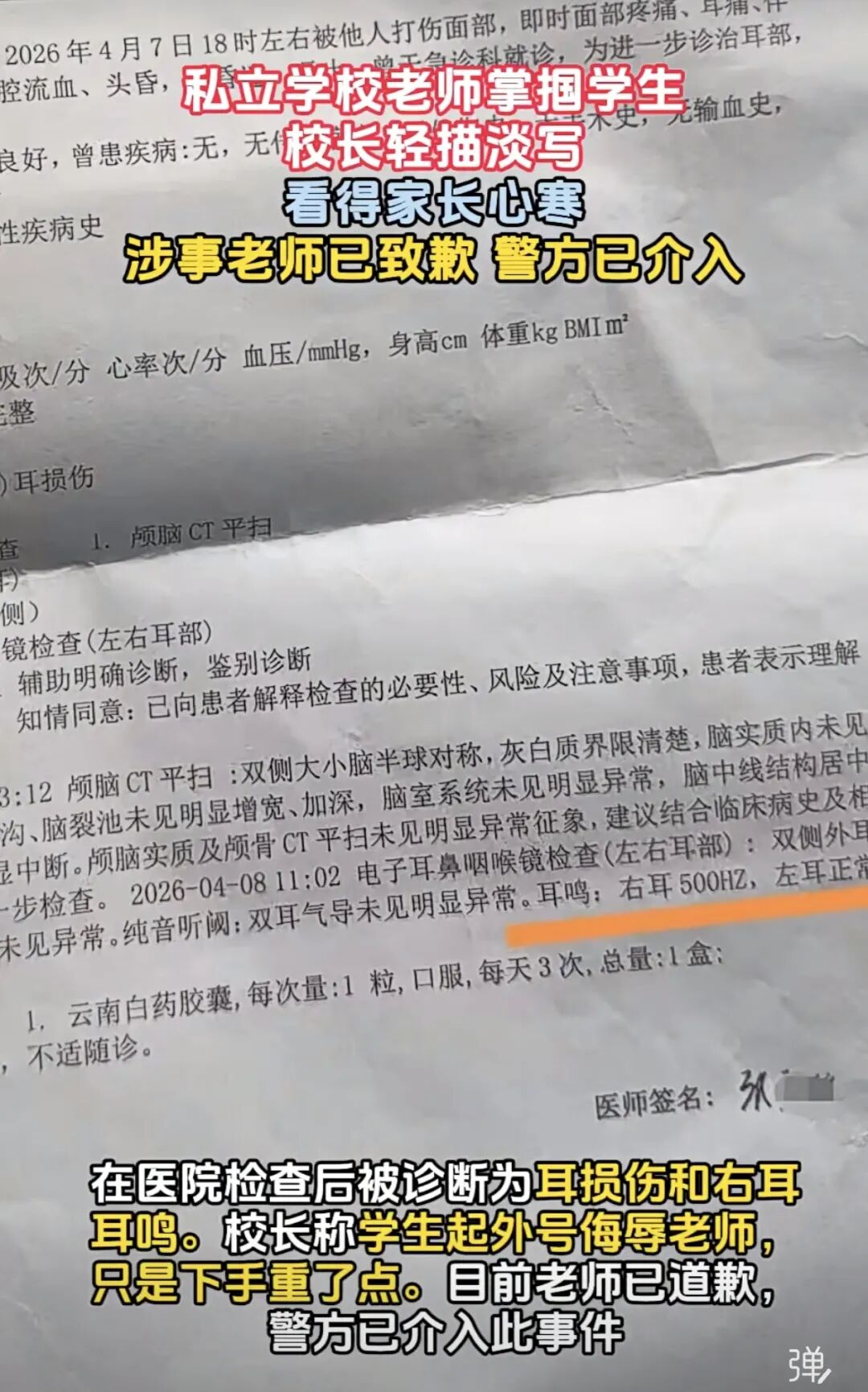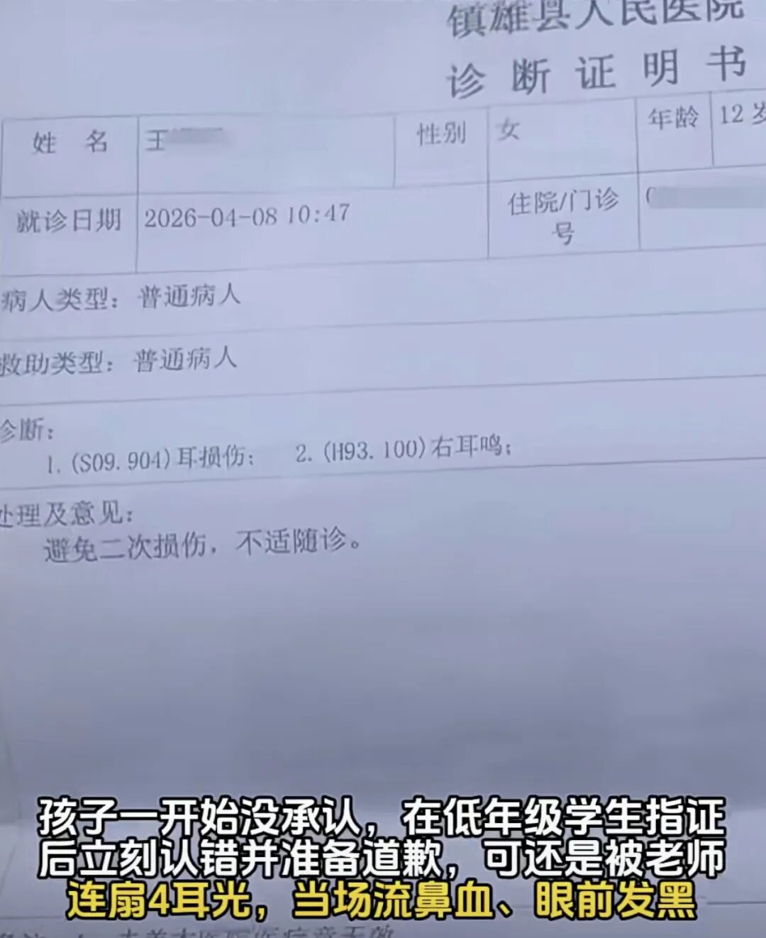 女孩当场鼻血喷涌、眼前发黑,随后出现头晕、耳鸣。次日家长带其就医,诊断为耳损伤、右耳耳鸣,需住院/进一步治疗。事发后,涉事老师道歉,校长称“下手重了点”,警方与教体局介入调查。