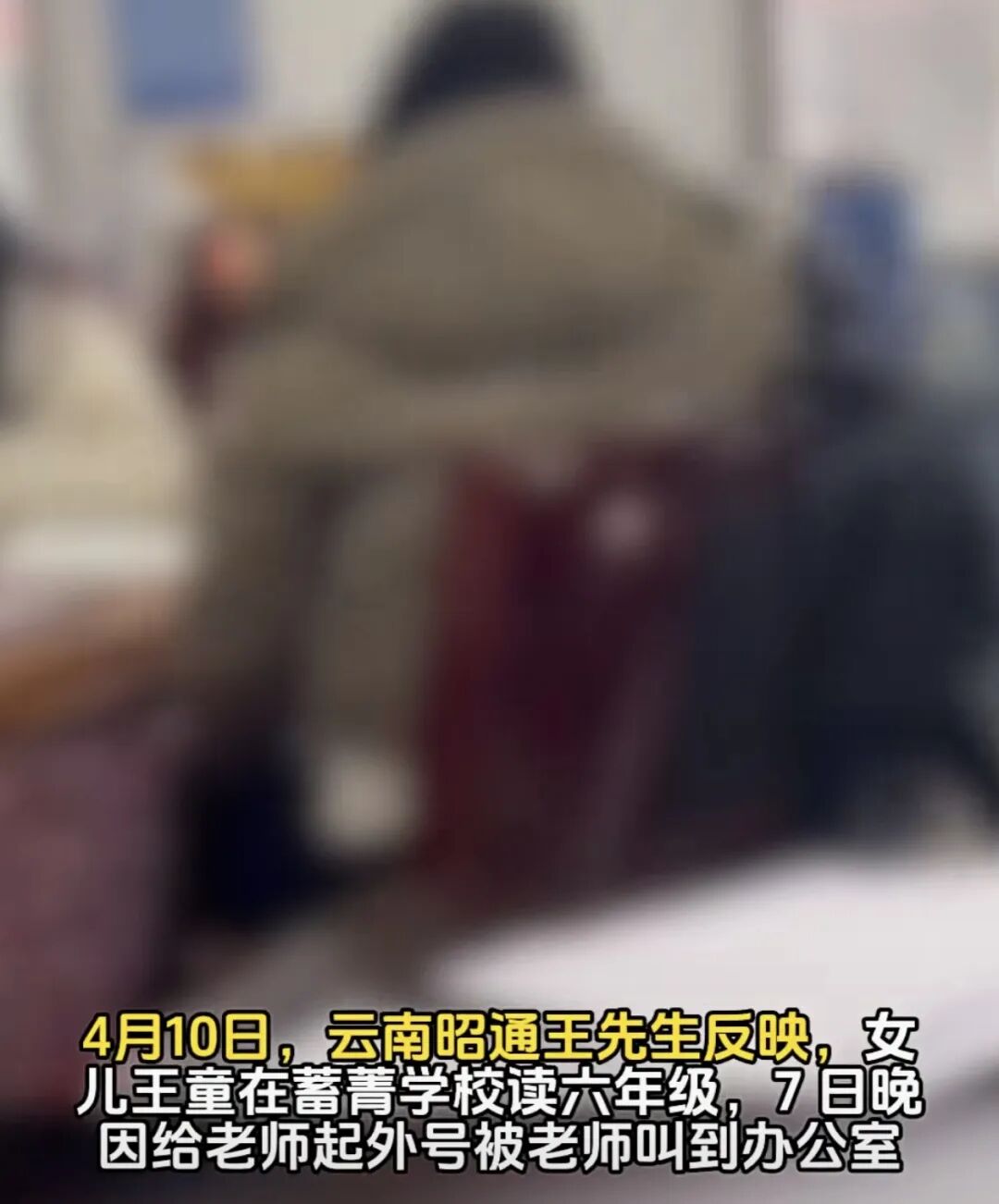 2026年4月7日晚,云南昭通镇雄县蓄菁学校(私立)发生一起体罚事件。该校12岁六年级女生王童(化名),因背后辱骂一名三年级女老师为“非洲大母叉”(侮辱性外号),被老师叫至办公室质问。王童起初否认,经同学指证后认错,正欲道歉时,老师突然捏住其脸,当众连扇四记耳光。