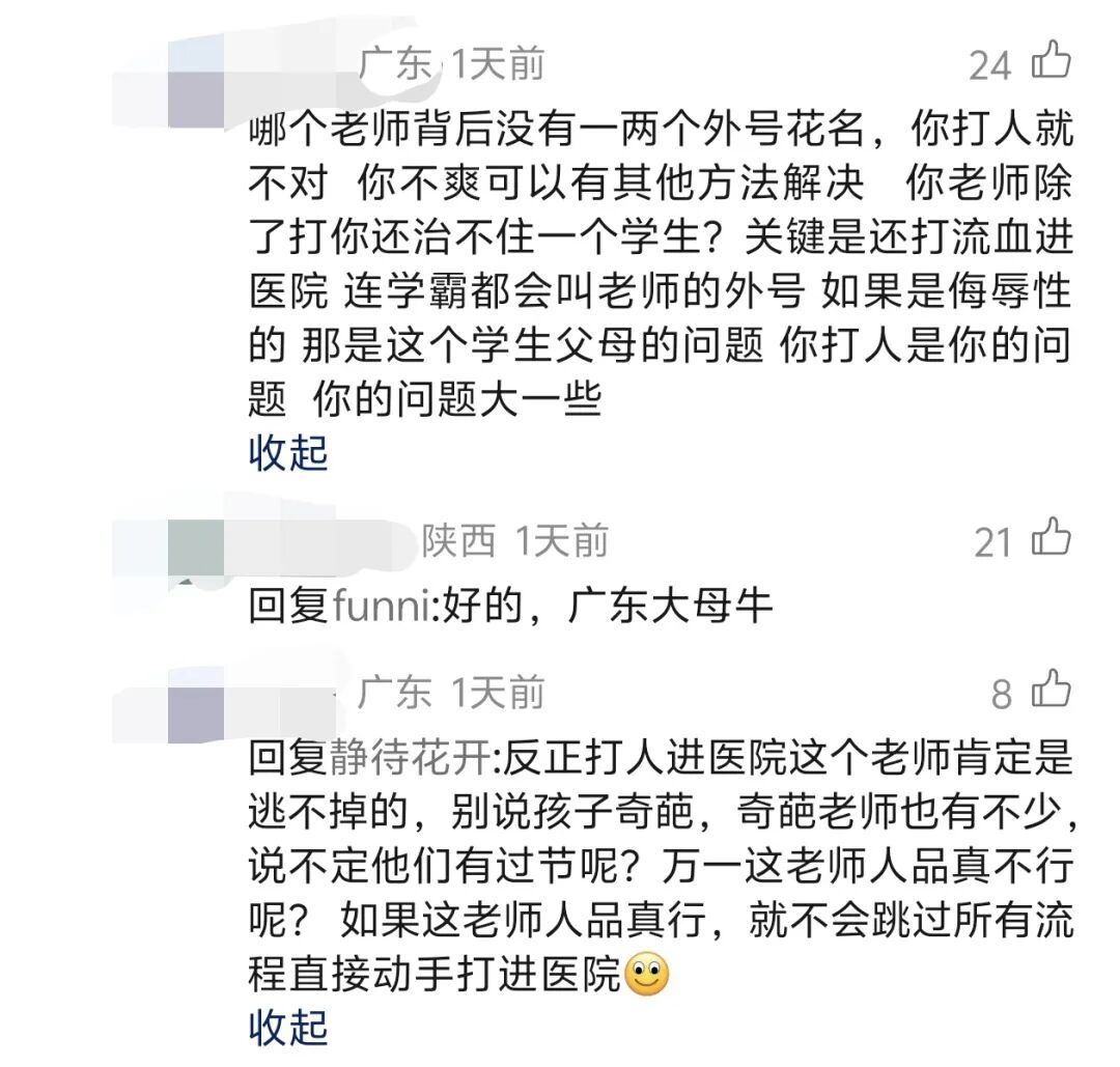 但是认为老师做的很不对的人则觉得:在大家上小学的时候,谁没给老师起过外号?哪个人不是背地里偷偷骂老师?就因为这几句话,老师就动手打人,这气量未免也太小了吧?不行的话,老师还有别的方式去管教呀,如果都动手打人的话,那学校成什么地方了?